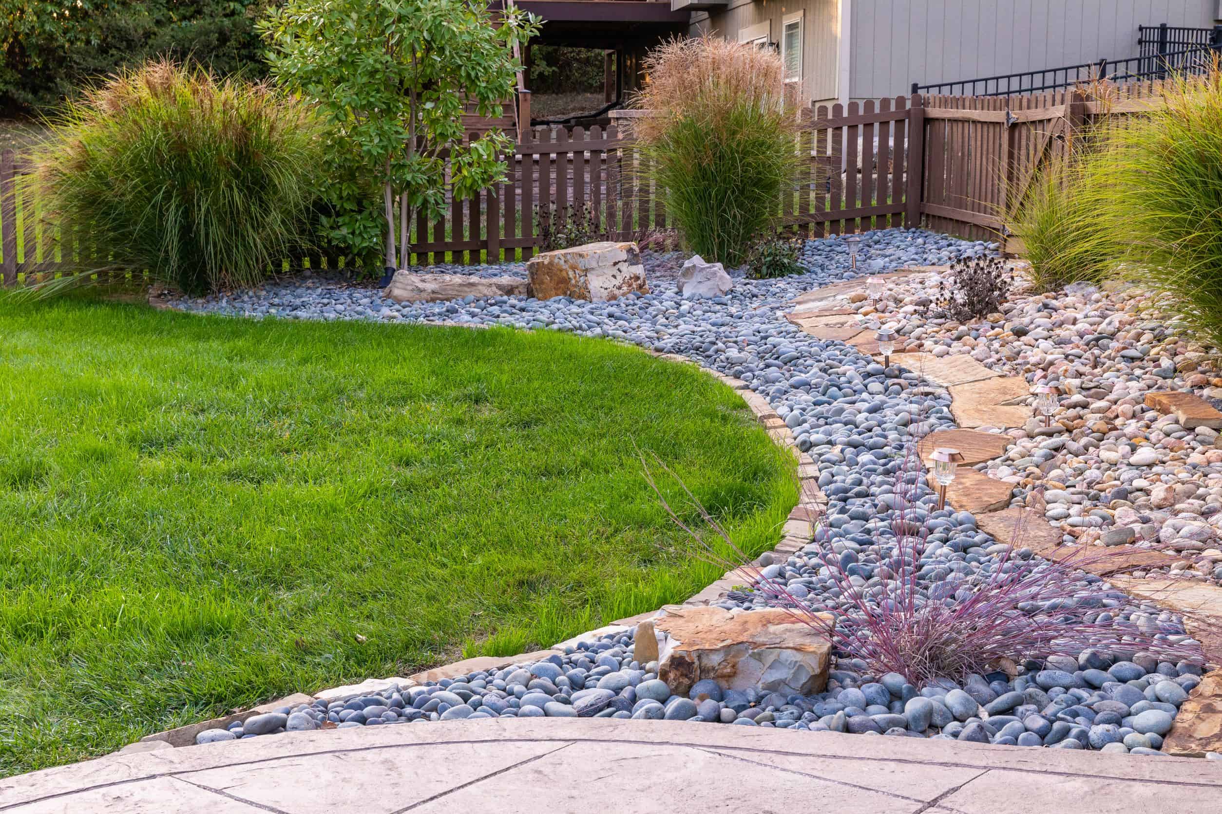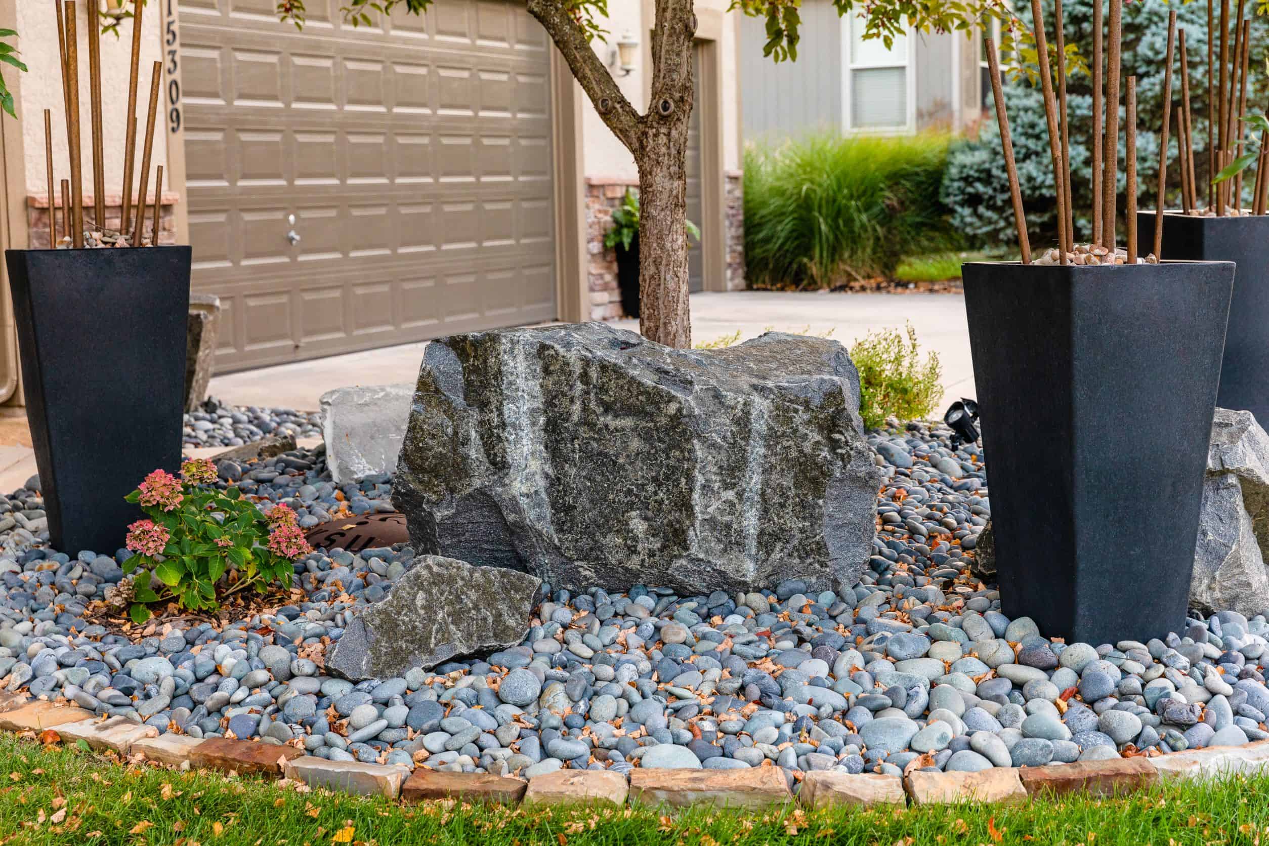 Designed & Installed by Trae Rickford of 7 Design. Products Featured: Mexican Beach Pebbles, Cobalt Black Boulders, Blackhills Rustic Patio Flagstone, Colorado River Rock, Blackhills Rustic Edging, Rustic Boulders, Versa-Lok Wall Block